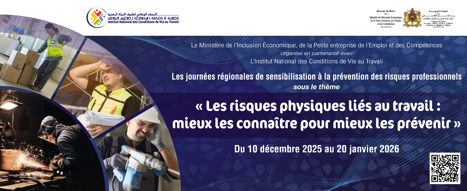 تنظم وزارة الإدماج الاقتصادي والمقاولة الصغرى والتشغيل والكفاءات بشراكة مع المعهد الوطني لظروف الحياة المهنية، اثنا عشرة (12) يوما جهوياً للتحسيس حول الوقاية من المخاطر المهنية لفائدة المقاولات والفاعلين المحليين. وسيعطي السيد الوزير الانطلاقة الرسمية